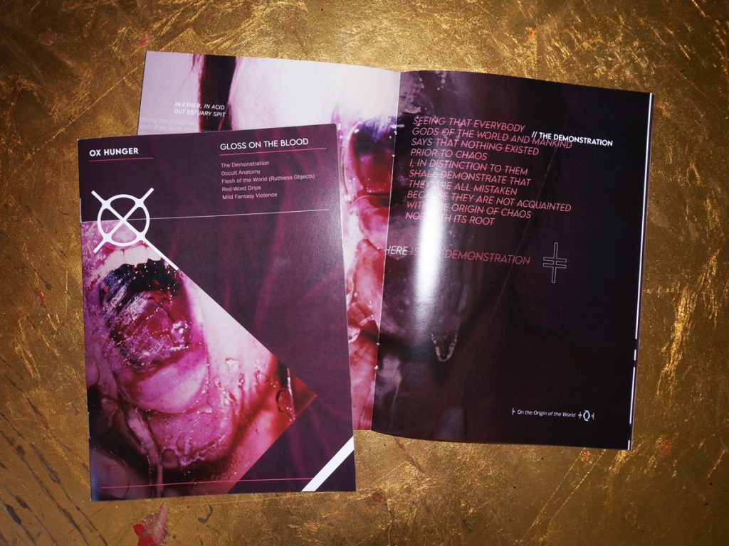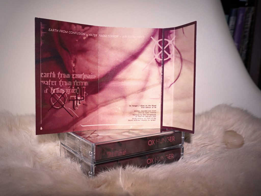 Gloss on the Blood is Ox Hunger’s first self-released EP. It draws on medieval mysticism and gnostic origin stories to construct and anchor a practice for working with themes of body horror and dysmorphia, as anger/desire contend and stutter into something awfully wanting, something at the edge of legibility.